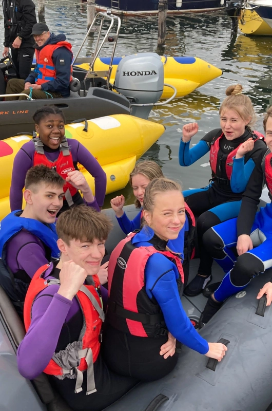 Først padler vi over på SUP-board eller i kajak, hvor balance og teknik er i fokus. Derefter tager vi turen igen – denne gang ved at svømme tværs over fjorden. Til sidst krydser vi fjorden i fuld fart, når vi sejler med speedbåd og banan hen over vandet